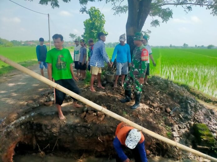 ACTUALNEWS.ID Sragen, Serda Tri Hartono Babinsa Bumiaji Anggota Koramil 06 /Gondang Kodim 0725/Sragen melaksanakan gotong royong bongkar pasang gorong- gorong bersama masyarakat di dukuh Ngabeyan RT 19 Ds. Bumiaji Kec. Gondang, Selasa ( 26/03/2024 )