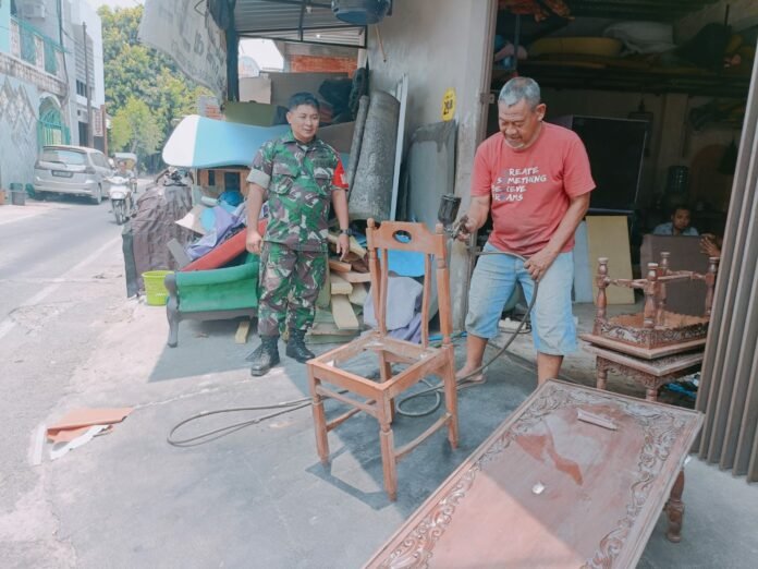 ACTUALNEWS.ID, Surakarta– Bintara pembina desa (Babinsa) Kelurahan Danukusuman Koramil 03/Serengan Kodim 0735/Surakarta Sertu Rochani bersama Linmas pada pukul 08.00 wib hingga selesai melaksanakan kegiatan Komsos dengan para pelaku UMKM (Usaha Mikro, Kecil dan Menengah) Milik Ibu Tatik Yang bergerak dalam usaha Furniture di Jl. Mayangsari No 29B Rt.02/Rw.13 Danukusuman Serengan Kota Surakarta, (28 Oktober 2023).