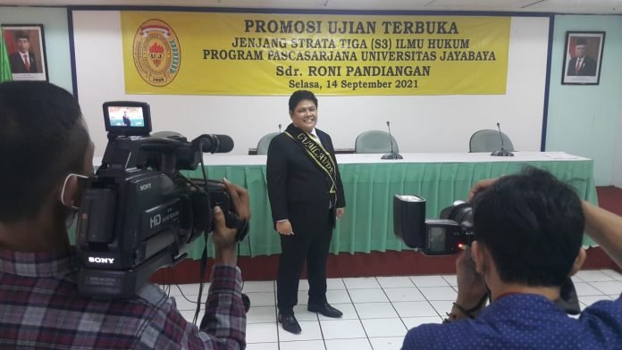 Gelar pendidikan tertinggi Doktor yang diraihnya dilaksanakan acara penganugerahan di ruang seminar lantai 5 Universitas Jayabaya, Jakarta. Roni Pandiangan berhasil meraih gelar Doktor Cum Laude.
