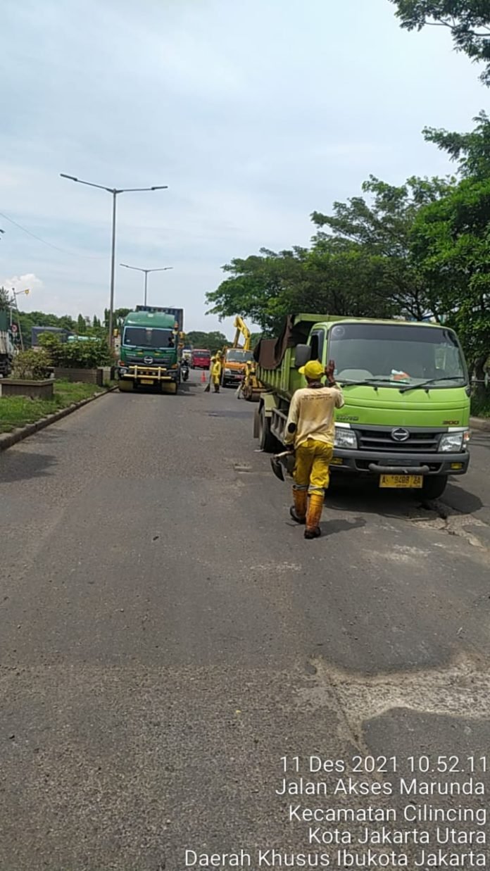 Kasatpel Suku Dinas Bina Marga Kecamatan Cilincing, Jakarta Utara, Riri menjelaskan bahwa Jalan Akses Marunda di Kecamatan Cilincing telah dilakukan perbaikan beberapa segmen yang rusak berat.