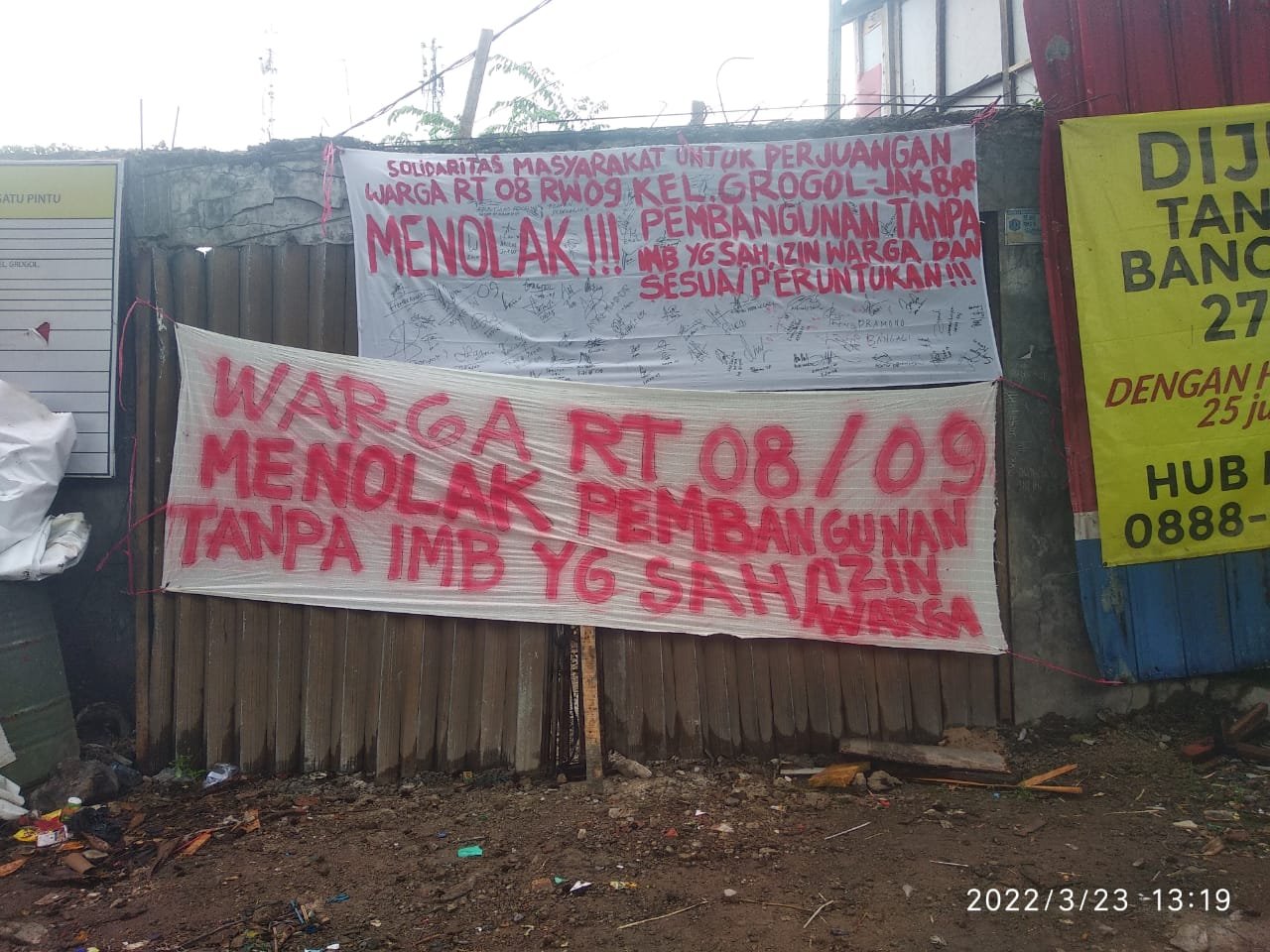 Penyegelan warga dilakukan dengan membentangkan 2 buah spanduk berukuran 3 dan 4 meter didepan tanah pemilik lahan yang akan dibangun dengan tulisan “Warga RT 08/09 Menolak Pembangunan Tanpa IMB Yang Sah dan Izin Warga” dan “Solidaritas Masyarakat Untuk Perjuangan Warga RT 08 RW 09 Kelurahan Grogol MENOLAK !!! Pembangunan Tanpa IMB Yang Sah, Tanpa Ijin Warga dan Sesuai Peruntukan” yang dibubuhi tanda tangan dari warga dilingkungan RW 09.