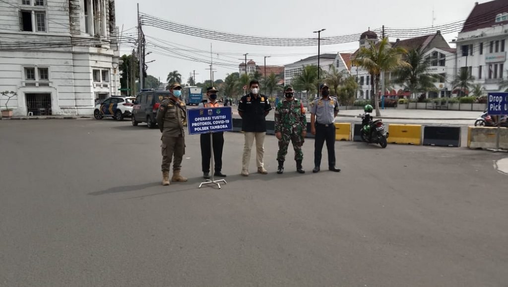 ACTUALNEWS.ID,Jakarta -25 personil gabungan Koramil 02/TB,Polsek Tambora,Satpol PP ,Damkar dan Dishub gencar melaksanakan operasi yustisi guna menekan sekaligus memutus mata rantai penyebaran vurus covid 19 menyasar Jalan Kalibesar Barat RW 02 Kelurahan Roamalaka Kecamatan Tambora Jakarta Barat.