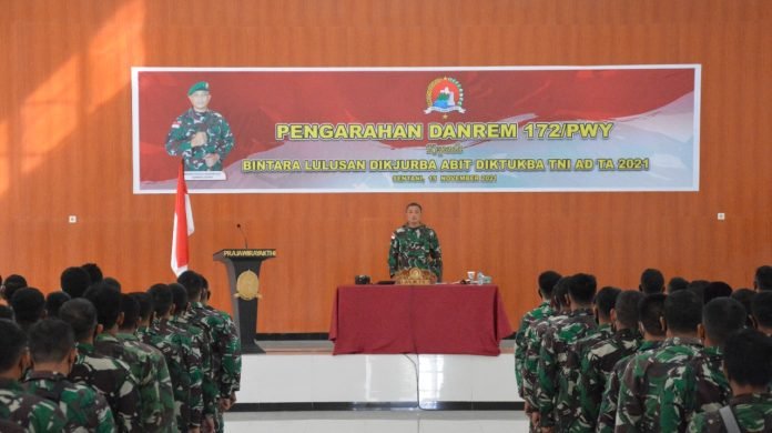 ACTUALNEWS.ID, Jakarta – Sebanyak 362 orang personel Bintara Lulusan Dikjurba Abit Diktukba TNI AD TA 2021 menerima pengarahan Komandan Korem (Danrem) 172/PWY Brigjen TNI Izak Pangemanan, bertempat di Aula Yonif 751/VJS, Distrik Sentani, Kabupaten Jayapura, Senin (15/11/2021).