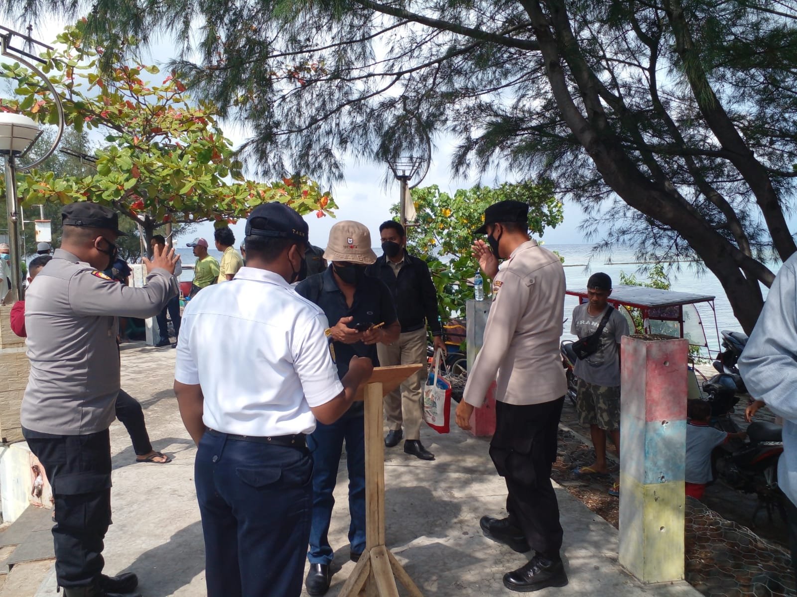 Kegiatan pengamanan serta penerapan prokes ketat terhadap 438 pengunjung yang tiba di dermaga kedatangan dilakukan untuk menciptakan sitkamtibmas kondusif