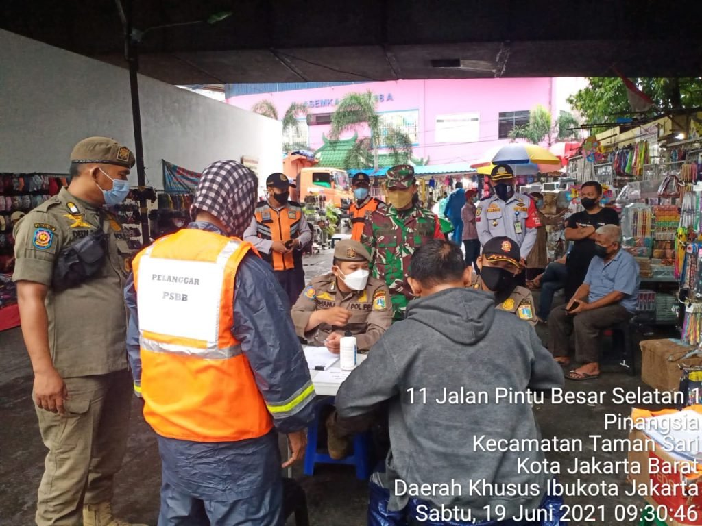Operasi yustisi di gelar di Pasar Asemka Jl.Pintu Besar Barat Kelurahan Pinangsia Kecamatan Tamansari Jakarta barat, 20 personil gabungan dari Koramil 01/TS Sertu Supriyanto, Polsek Tamansari, Satpol PP dan Dishub menyasar warga yang berjalan kaki tanpa menggunakan masker dan pengendara kendaraan roda dua dan empat yang berpenumpang lebih dan tidak menggunakan masker.