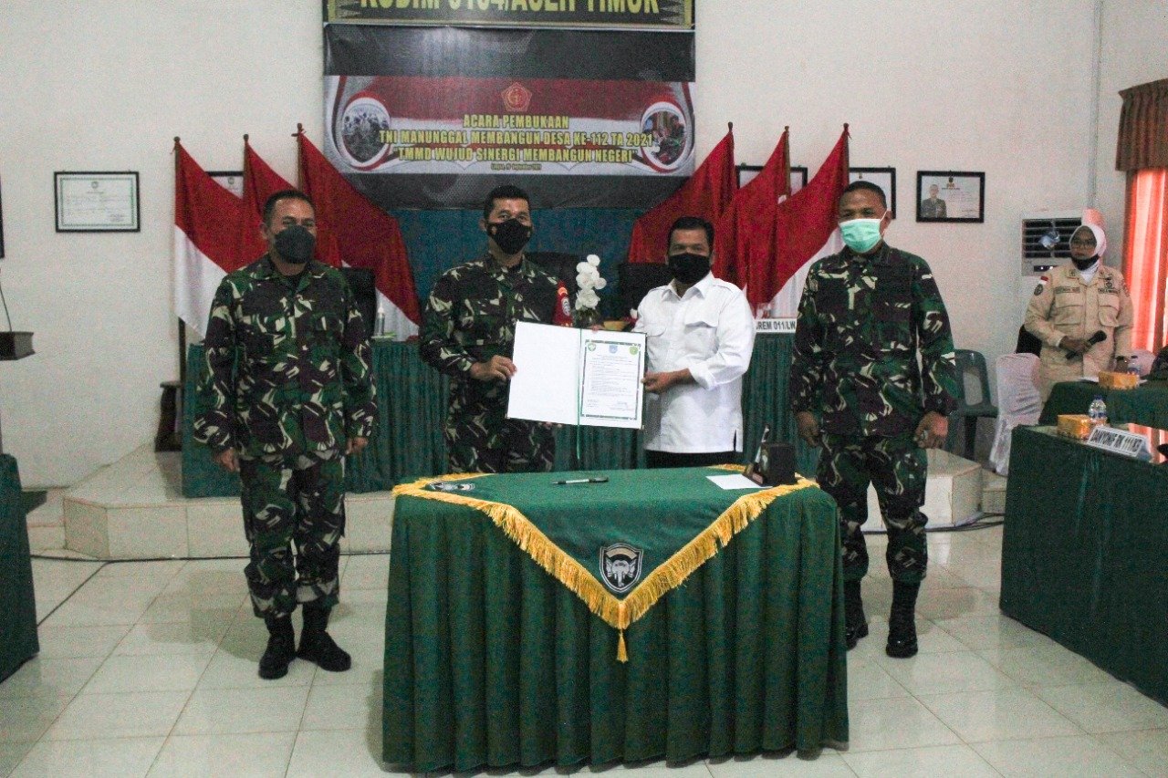 Pembukaan dilaksanakan secara simbolis dengan penandatanganan dan penyerahan berita acara penyerahan alokasi dana APBK swakelola Kota Langsa untuk TMMD Reguler ke-112 Kodim 0104/Atim diserahkan langsung oleh Walikota Langsa Usman Abdullah, SE kepada Dandim 0104/Atim Letkol Czi Hasanul Arifin Siregar, S.Sos, M.Tr (Han) yang disaksikan langsung oleh Kapoksahli Pangdam IM Brigjen TNI Primadi Saiful Sulun, S.Sos, M.Si., dan Kasrem 011/LW Letkol Inf Sunardi Istanto dan unsur Forkopimda yang hadir.