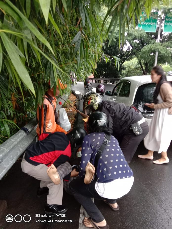 Saat tiba di jalan raya jeruk purut permata hijau Jakarta Selatan kemudian menjumpai seorang pengendara yang diketahui bernama ibu lilik warga depok mengalami kecelakaan jatuh dari kendaraan sepeda motor miliknya