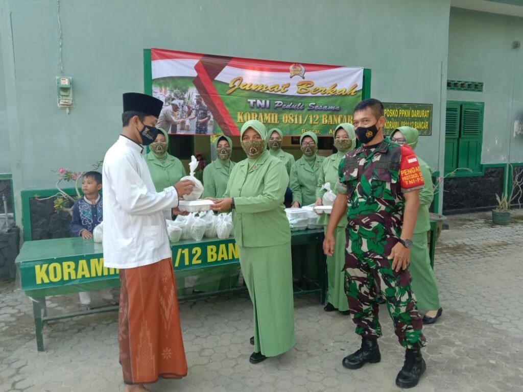 ACTUALNEWS.ID, Tuban – Upaya membantu warga masyarakat disaat perekonomian sedang terpuruk pasca Pandemi Covid-19, maka anggota Koramil 0811/12 Bancar bersama Ibu-ibu Persit Kartika Chandra Kirana (KCK) Cabang XXVI Kodim 0811 Tuban Ranting 13 melakukan kegiatan ‘Jum’at Berkah’ saat bulan suci Ramadhan di depan Makoramil Jl. Raya Bulu – Jatirogo, Kecamatan Bancar, Kabupaten Tuban, Jum’at (22/04/2022).