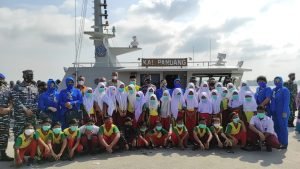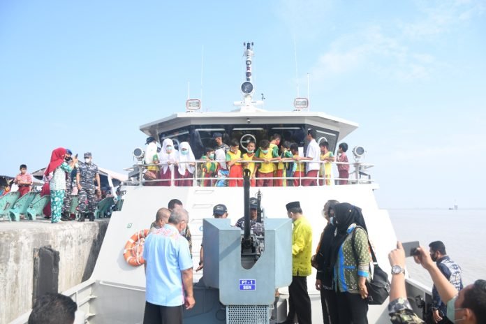ACTUALNEWS.ID, Tanjung Balai – Anak-anak sSkolah Dasar Tanjungbalai Asahan terlihat gembira saat menaiki KAL Pandang I-I-72 Lanal TBA saat berlangsungnya Vaksinasi Maritim Anak-Anak Usia 6-11 Tahun yang dipantau langsung oleh Komandan Lanal TBA Letkol Laut (P) Robinson Hendrik Etwiory dan Ketua Cabang 7 Korcab I DJA I Ny. Shinta Etwiory di Dermaga Phanton Bagan Asahan, Kamis (20/01/2022).