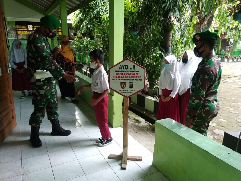 “Sejalan dengan keseriusan pemerintah dalam memutus mata rantai penyebaran virus Covid-19 dan memberikan sosialisasi prokes kepada warga, murid sekolah yang mulai pembelajaran tatap muka disekolah ditekankan untuk selalu menggunakan masker saat beraktifitas di sekolah maupun menerapkan protokol kesehatan lainnya.” ujar Babinsa
