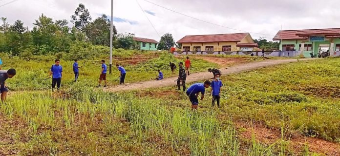 ACTUALNEWS.ID, Seriang – Anggota Satgas Pamtas RI-Malaysia Yonif 144/JY melaksanakan gotong royong bersama anak-anak SMP N 03 di desa Seriang Kecamatan Badau Kabupaten Kapuas Hulu Kalbar.
