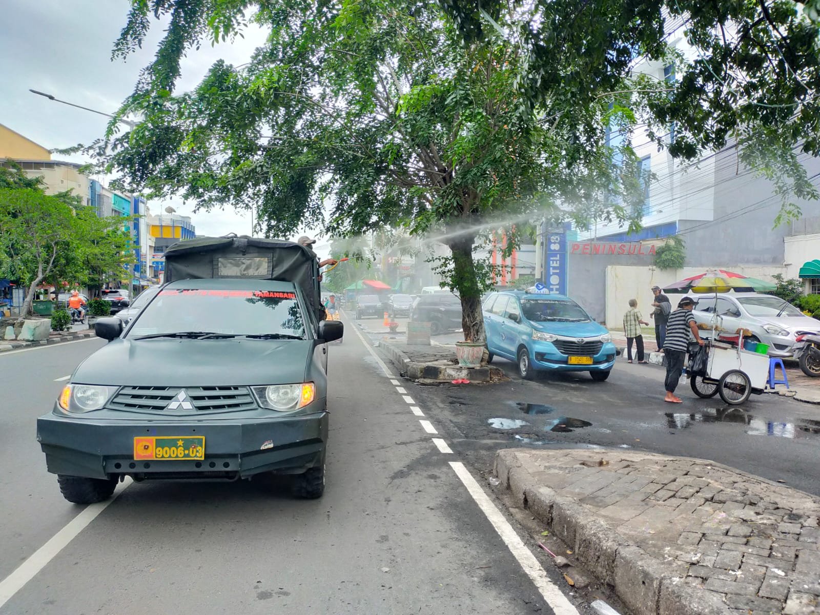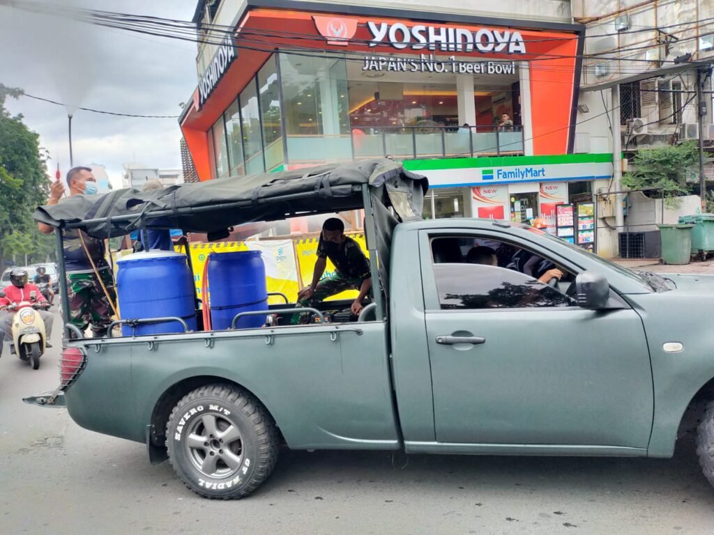 Kegiatan penyemprotan dan himbauan protokol kesehatan di pimpin Batuud Koramil 01/TS, Peltu Anton S dengan menggunakan kendaraan dinas (Randis) Koramil 01/Tamansari.