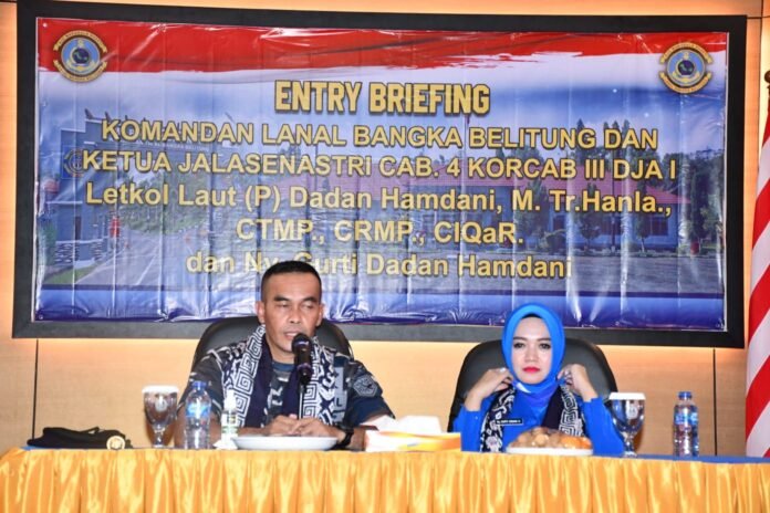 ACTUALNEWS.ID, Babel – Komandan Lanal Babel Letkol Laut (P) Dadan Hamdani, M.Tr.Hanla., CTMP., CRMP., CIQAR., dan Ketua Jalasenastri Cabang 4 Korcab III DJA I Ny. Gurti Dadan Hamdani menggelar exit brifing dalam rangka mengawali penugasan di Lanal Babel kepada seluruh Prajurit dan Keluarga Besar Lanal Babel di Balai Prajurit RE Martadinata Mako Lanal Babel, Jalan Tanjung Gudang, Kecamatan Belinyu, Kabupaten Bangka, Sabtu (12/3/2022).