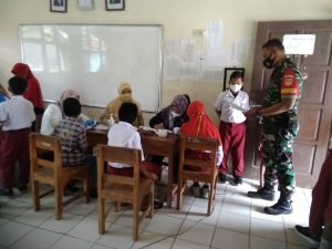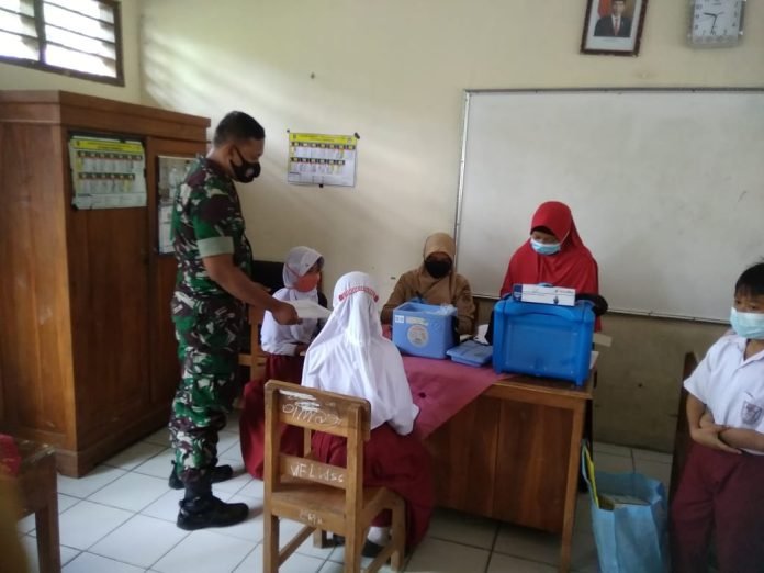 “Vaksinasi Covid 19 yang kali ini diprioritaskan bagi anak usia dini usia 6-11 tahun.Kehadiran kami untuk memantau ketertiban terutama ketertiban protokol kesehatan saat proses vaksinasi berjalan”, jelas Serda Sukoco