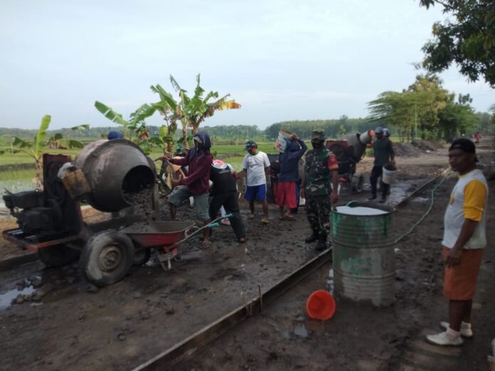 ACTUALNEWS.ID, Sragen – Serka Darwanto Babinsa Kaliwedi anggota Koramil 06/Gondang Kodim 0725/Sragen melaksanan giat Bakti TNI dalam rangka membantu Kerja Bakti Pengecoran Jalan sepanjang 335 m di Dk. Dimoro Rt 17, Desa Kaliwedi, Kecamatan Gondang, Kabupaten sragen, Minggu (27/03/2022)