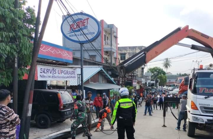 Babinsa Koramil 0901-02/Sungai Pinang Kodim 0901/Samarinda Kopka Azmiadi kembali turun tangan, kali ini bersama jajaran Polresta Samarinda dan relawan melakukan evakuasi atas insiden pipa besi tiang pancang yang berhamburan dari truk tersebut sebanyak 8 batang pipa masing-masing seberat 1,3 ton.