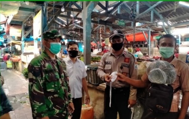 Dalam kegiatannya Sertu Asrianto membagikan 100 masker kepada masyarakat yang tidak menggunakan masker di PD Pasar Palapa