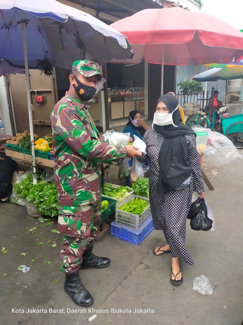 Dalam kegiatannya Sertu Asrianto membagikan 100 masker kepada masyarakat yang tidak menggunakan masker di PD Pasar Palapa