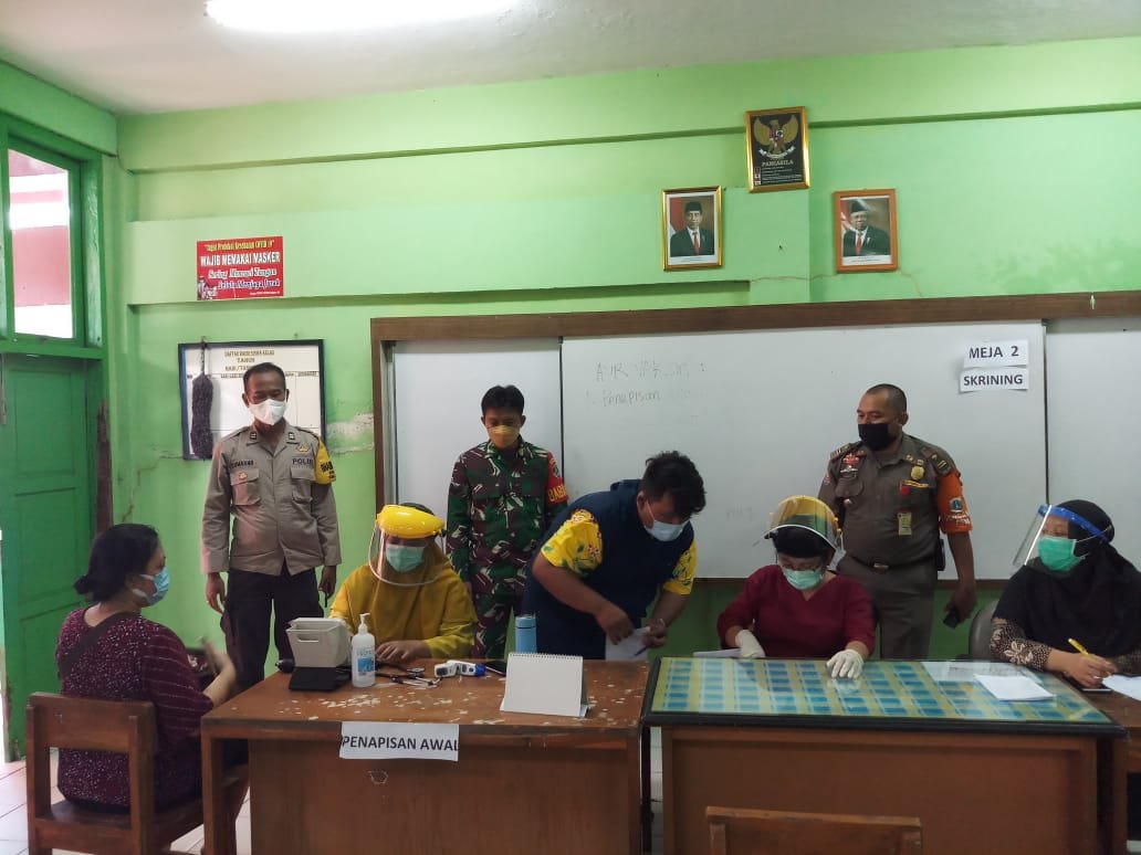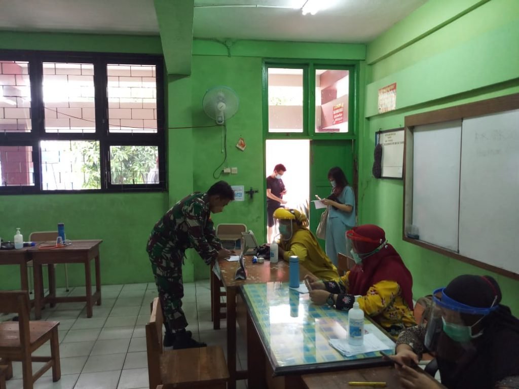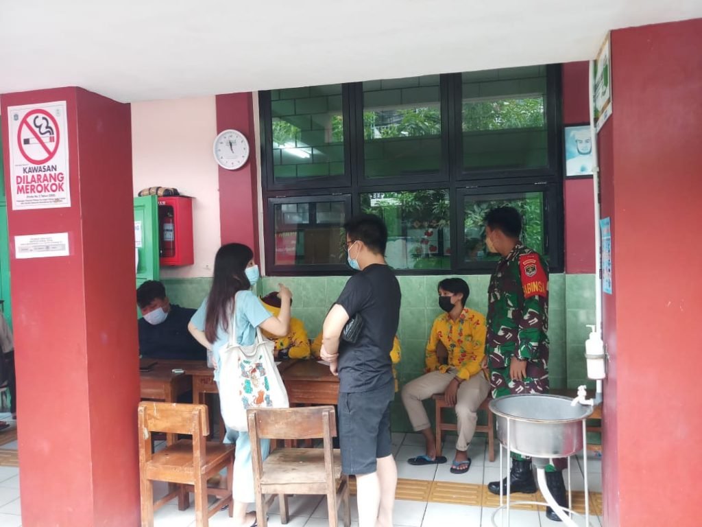 Di tempat terpisah pelaksanaan Suntik vaksin di laksanakan di SD Negeri 01 Pinangsia di Komplek Pertokoan Glodok Plaza RW 05 Kelurahan Pinangsia Kecamatan Tamansari Jakarta Barat monitoring/ Pengamanan Pelaksanaan penyuntikan vaksin oleh Babinsa 01/Tamansari Serka Wakdinator