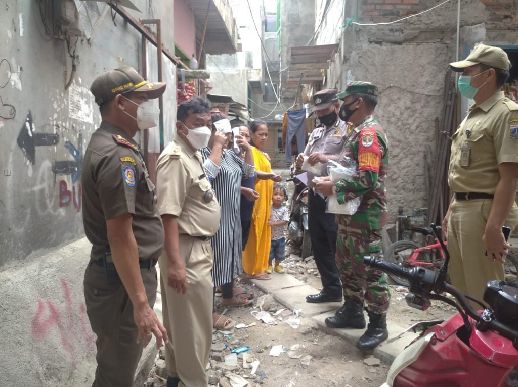 ACTUALNEWS.ID, Jakarta-Babinsa Koramil 02/TB Kodim 0503/JB Kelurahan Jembatan Besi Serma Patton CH bersama Lurah Jembatan Besi Iwan Setiawan melaksanakan kegiatan pembagian masker.