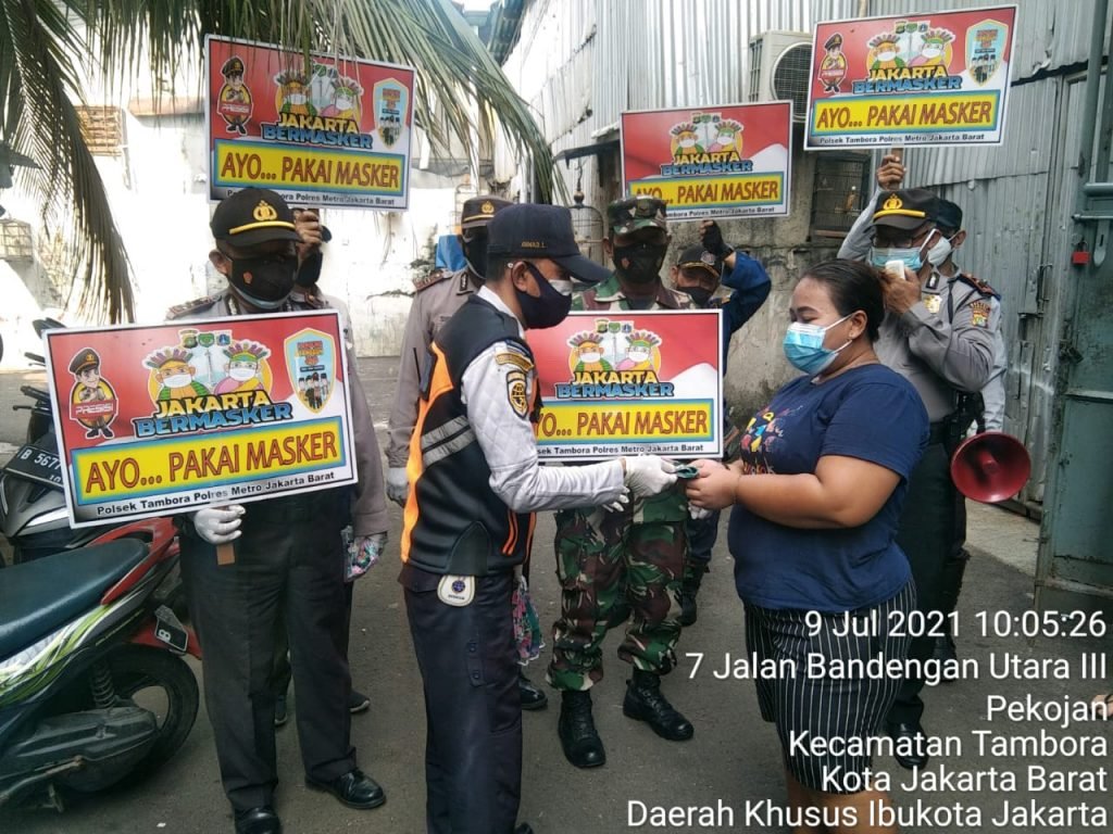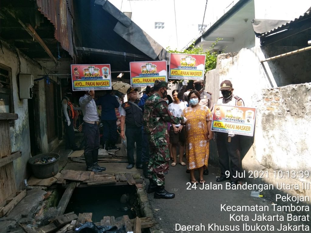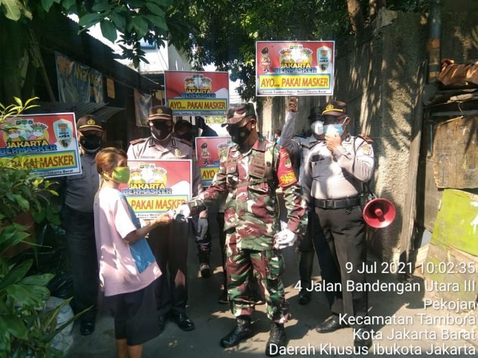 ACTUALNEWS.ID, Jakarta – Babinsa Koramil 02/TB Serda Tri Nurhasan, Polsek Tambora, Pol PP, Dishub dan Damkar melaksanakan kegiatan PPKM kepada warga masyarakat di Jalan Gedong Panjang 1 RW 10/06 Kelurahan Pekojan Kecamatan Tambora Jakarta Barat, Jum’at (9/7).