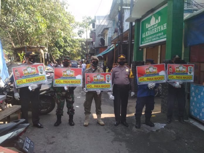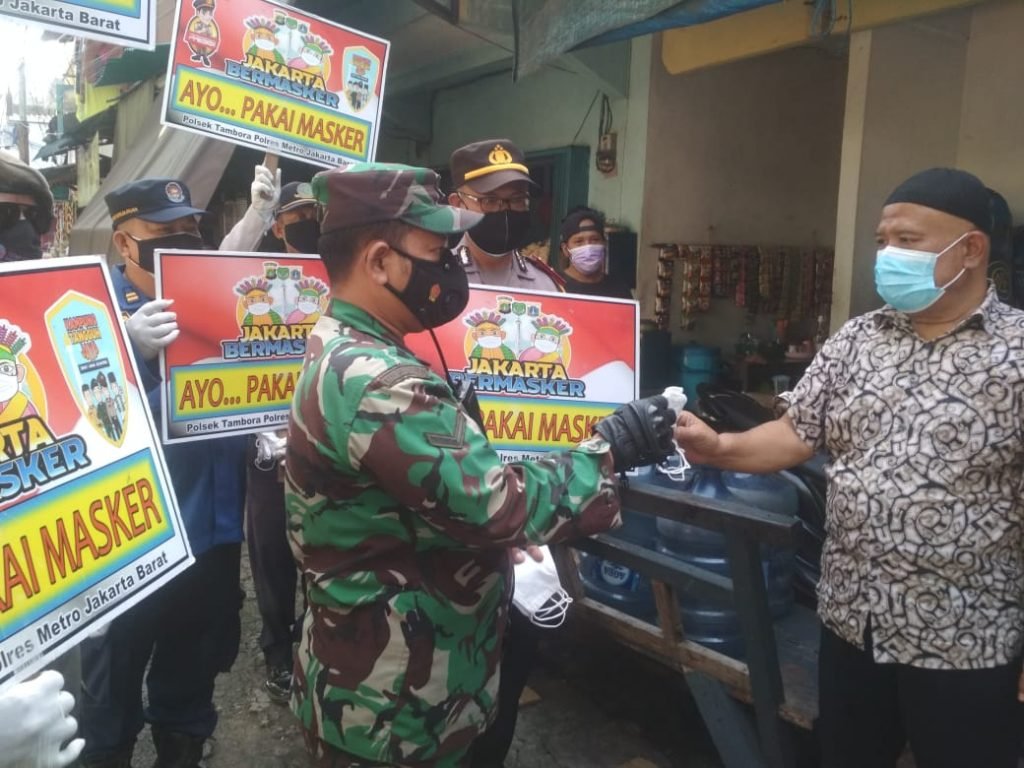 23 Petugas gabungan dari Koramil 02/TB, Polsek Tambora, Pol PP, Damkar dan Dishub membagikan 200 masker kepada warga yang tidak menggunakan masker dan memakai masker tidak layak pakai.