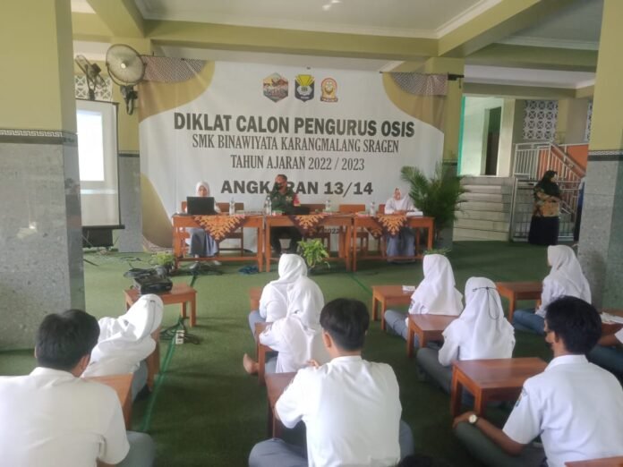 ACTUALNEWS.ID, Sragen, Serma Budi santoso Anggota Koramil 02/Karangmalang Kodim 0725/Sragen didampingi Serka Sugito memberikan pembekalan informasi tentang wawasan kebangsaan bagi para siswa/i Diklat calon pengurus OSIS SMK Binawiyata, Kamis ( 02/09/2022 ).