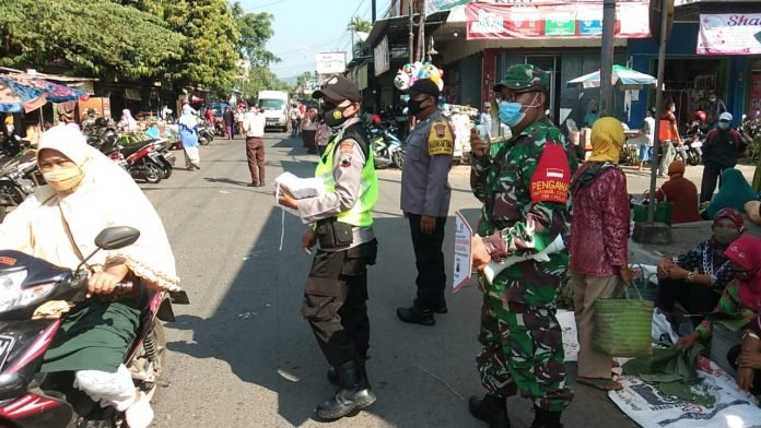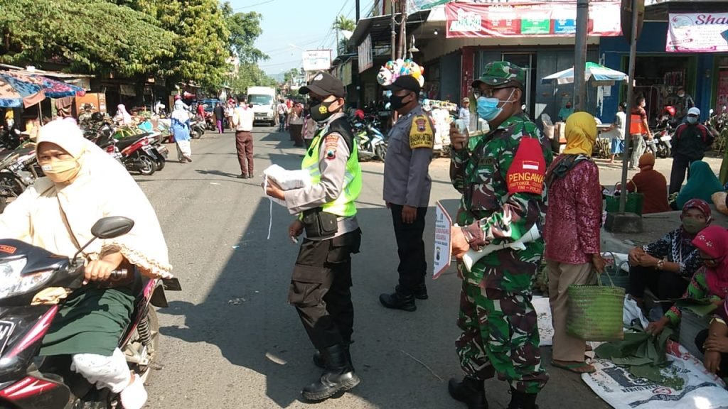 ACTUALNEWS.ID, Boyolali – Pandemi virus corona atau Covid-19 sampai detik ini belum hilang, sehingga penegakan disiplin protokol kesehatan harus ditingkatkan di tengah aktifitas masyarakat khususnya di pasar tradisional. Seperti yang dilaksanakan saat ini oleh petugas gabungan dari Koramil 12 Simo Kodim 0724/Boyolali dan Polsek Simo di Desa Pelem, Kecamatan Simo Kabupaten Boyolali. Senin (25/10).