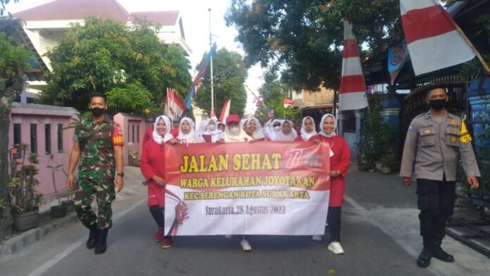 ACTUALNEWS.ID, Surakarta, Menyambut Hari Ulang Tahun (HUT) ke 77 Republik Indonesia (RI), Bintara Pembina Desa (Babinsa) Kelurahan Joyotakan Koramil 03/Serengan Kodim 0735/Surakarta, Serka M Nur Hakib dan Bhabinkamtibmas Aipda Fajar, monitoring Sekligus mengawal kegiatan jalan sehat di Taman Cerdas kel Joyotakan Kec Serengan Kota Surakarta, (28/8/2022)