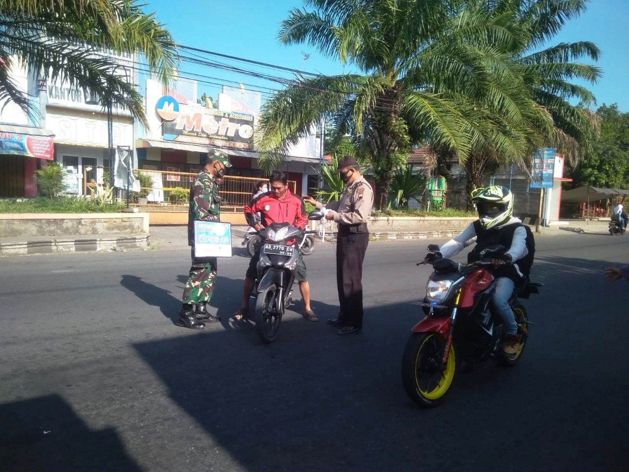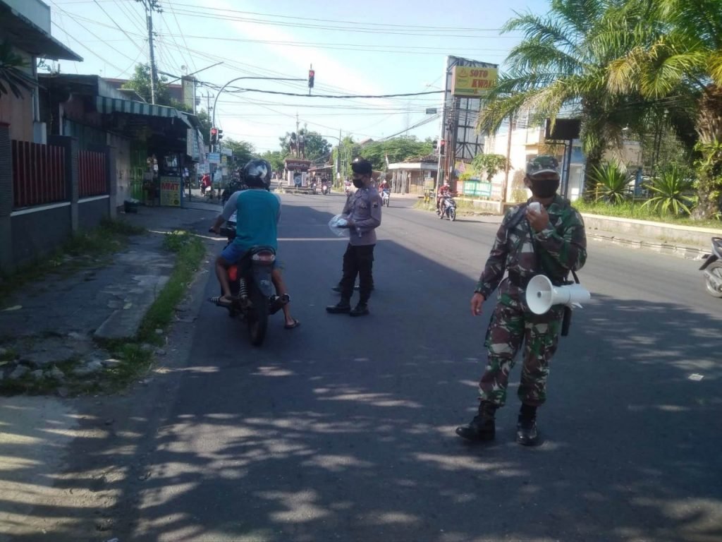 ACTUALNEWS.ID, Boyolali – Memutus mata rantai penyebaran Virus Corona(Covid-19), Babinsa Koramil 12/Simo Kodim 0724/Boyolali dipimpin Pelda Triatmoko serta Bhabinkamtibmas Polsek Simo melaksanakan patroli yustisi dan memberikan himbauan tentang pencegahan virus corona dengan cari memberikan protokol kesehatan 5 M
