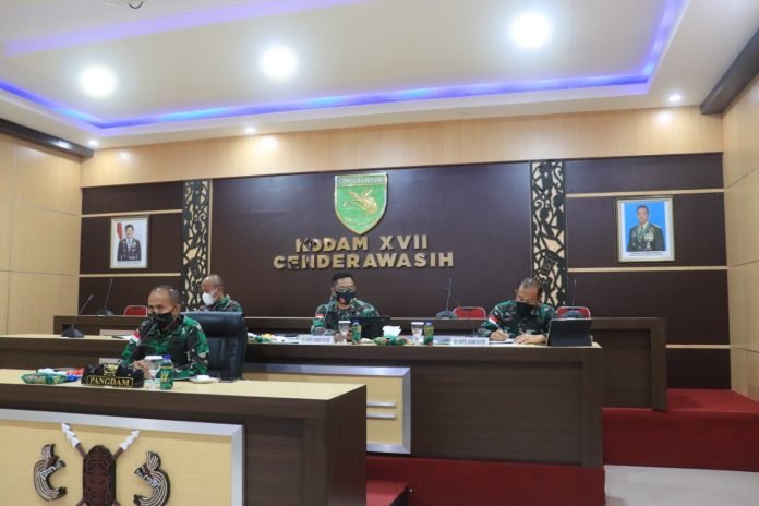 ACTUALNEWS.ID, Papua – Panglima Kodam XVII/Cenderawasih Mayjen TNI Ignatius Yogo Triyono, M.A mengikuti kegiatan Video Conference dengan Menkopolhukam RI Prof. Dr. Moh. Mahfud MD bertempat di Ruang Puskodalops Makodam XVII/Cenderawasih. Jumat (3/9/2021).