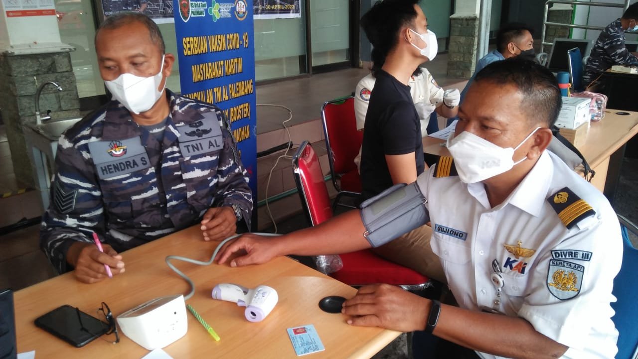 ACTUALNEWS.ID, Palembang, 27 April 2022,– Lanal Palembang menggelar Serbuan Vaksinasi Covid-19 Dosis 1, 2 dan Dosis lanjutan/Booster kepada warga Kota Palembang yang dilaksanakan di Stasiun Kereta Api Kertapati dan Pelabuhan Boom Baru Palembang dengan sasaran para Calon Penumpang, Keluarga Besar PT. KAI dan Pelindo serta masyarakat umum.