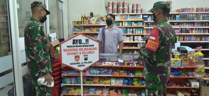 ACTUALNEWS.ID, Boyolali – Babinsa Mojosongo Koramil 03/Mojosongo, Kodim 0724/Boyolali, Sertu Ade bersama Satpol PP mengingatkan pengelola salah satu swalayan yang ada di Desa Mojosongo Kecamatan Mojosongo Kabupaten Boyolali agar selalu mengikuti protokol kesehatan (Prokes) yang telah di tetapkan oleh pemerintah pusat maupun oleh pemerintah daerah untuk mencegah penyebaran Covid-19. Rabu (20/10).
