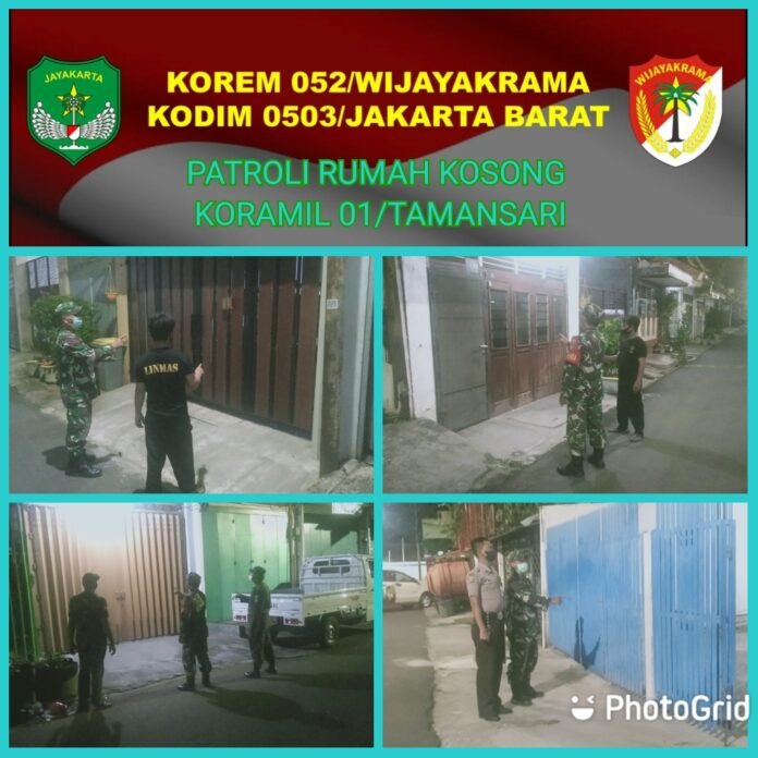 ACTUALNEWS.ID, Kodam Jaya, Kodim 0503/JB – Tingkatkan keamanan lingkungan di wilayah Koramil 01/Tamansari, Kodim 0503/JB terhadap pemukiman rumah kosong yang di tinggal mudik lebaran Babinsa bersama personil tiga pilar gelar patroli Malam hari pada pukul 22.00 hingga selesai, Sabtu, 07 Mey 2022.