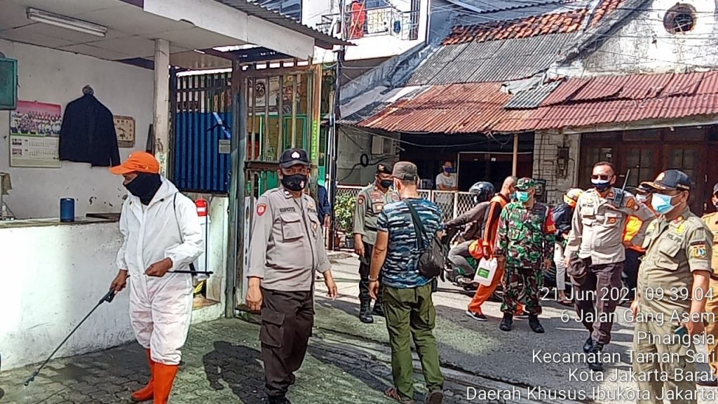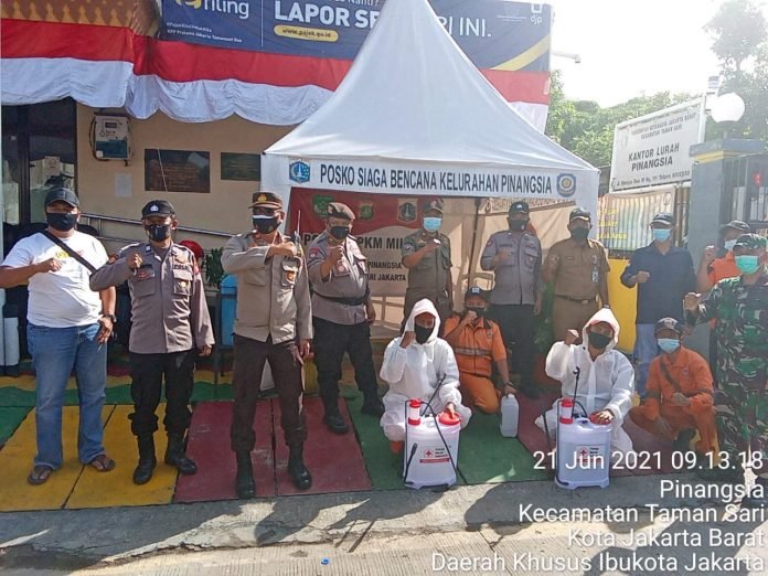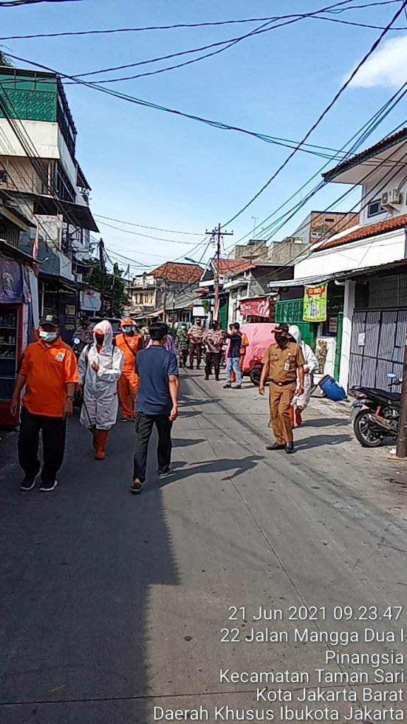 ACTUALNEWS.ID, Jakarta- Babinsa Koramil 01/TS Kodim 0503/JB Serma Wakdinator bersama tiga pilar melaksanakan Giat Penyemprotan cairan Disinfektan, pembagian masker dan himbauan kepada warga untuk mematuhi Prokes, senin (21/6) pagi.