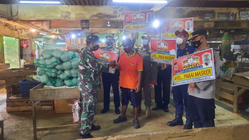 Kegiatan Sosialisasi PPKM dan pembagian masker berlangsung di Pasar Mitra Jalan KH.Moh Mansyur, Rt 001/01, Kelurahan Jembatan lima, Kecamatan Tambora Jakarta Barat. dengan melibatkan 17 personil gabungan dari Koramil 02/TB, Polsek Tambora, Pol PP, Damkar dan Dishub.