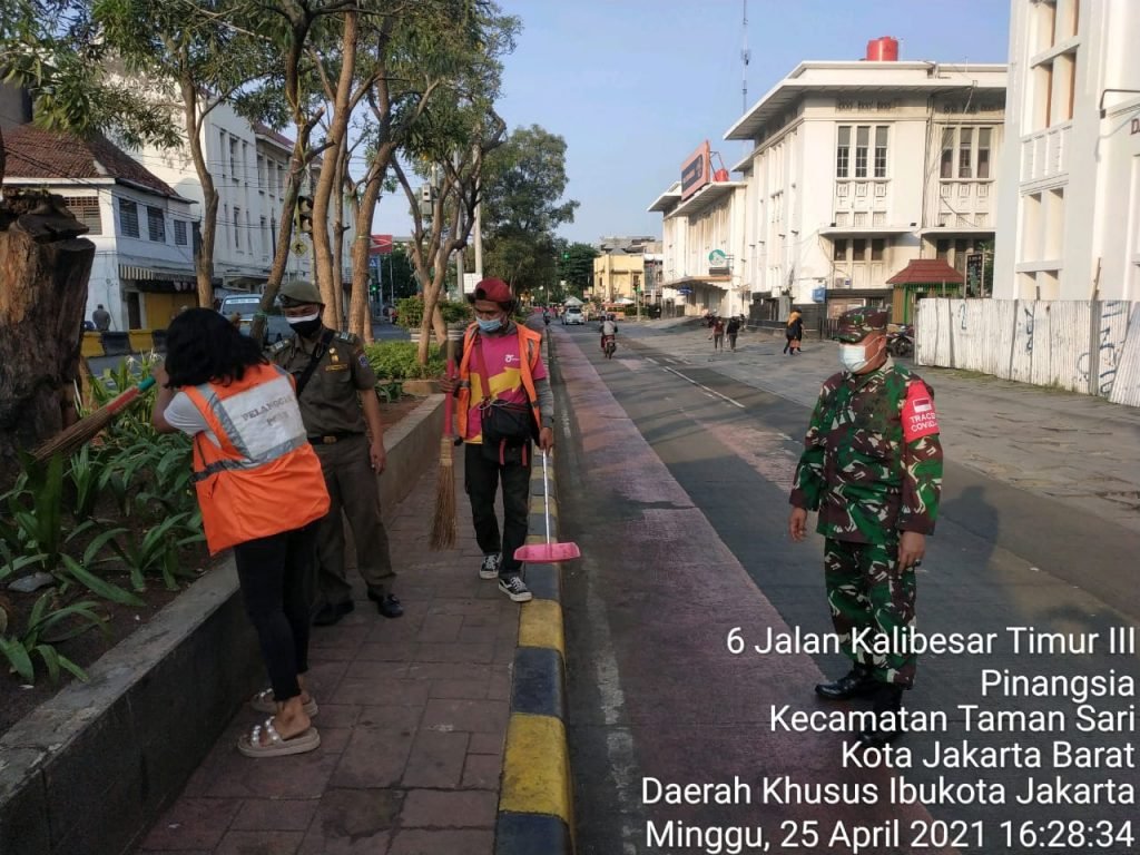 ACTUALNEWS.ID, Jakarta -60 Personil gabungan dari Koramil 01/TS Serda Junadi ,Polsek Tamansari,Polres ,Lantas,Satpol PP, dan Dishub atau disebut Tiga Pilar itu menyasar Pejalan Kaki dan pengendara kendaraan yang tidak menggunakan masker di Jalan Kunir Kota Tua