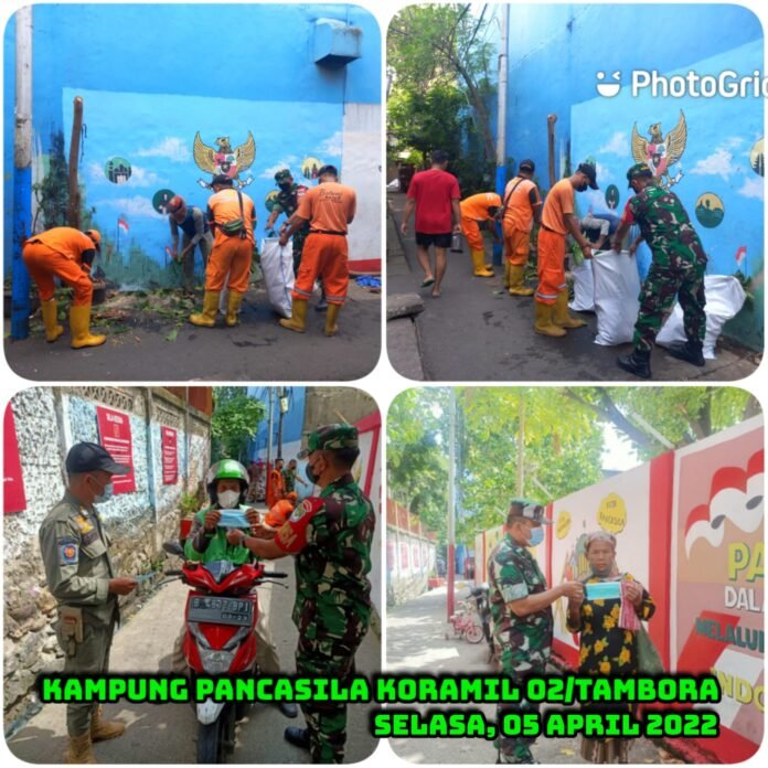 Bersama warga dan PPSU Babinsa juga mengecat tembok dan mengangkut sampah di sekitar Kampung pancasila selain pembersihan di Kampung Pancasila, Babinsa Koramil 02/Tambora juga memberikan Masker kepada Masyarakat yang belum taat akan Prokes Kesehatan dalam masa Pandemi Covid 19.