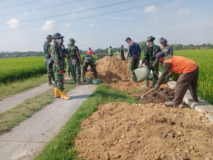 ACTUALNEWS.ID, Sukoharjo – (02/10/21) Sejumlah anggota Satgas TNI Manunggal Membangun Desa (TMMD) Reguler ke- 112 Kodim 0726/Sukoharjo, melakukan gotong royong dengan warga meratakan tanah berem di jalan TMMD yang sudah selesai dicor di Desa Majasto Kecamatan Tawangsari.