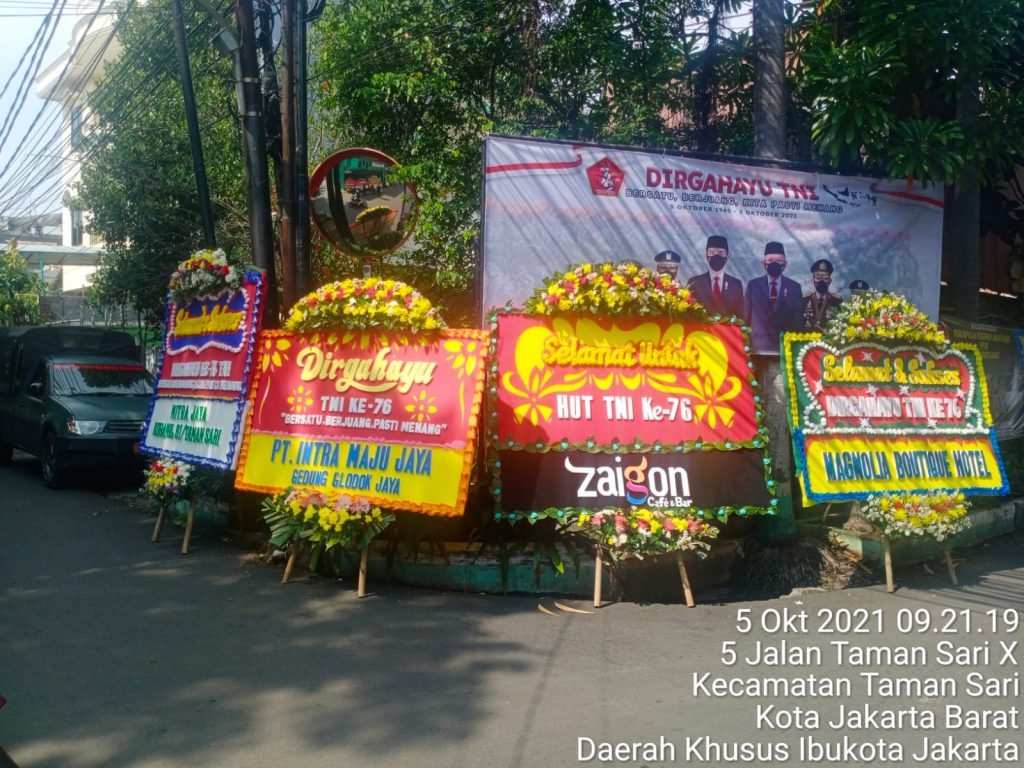 Koramil 01/Tamansari dibanjiri ucapan melalui karangan bunga dari berbagai instansi Pemerintah maupun dari kalangan masyarakat yang cinta dengan TNI ,Selasa (05 Oktober 2021)