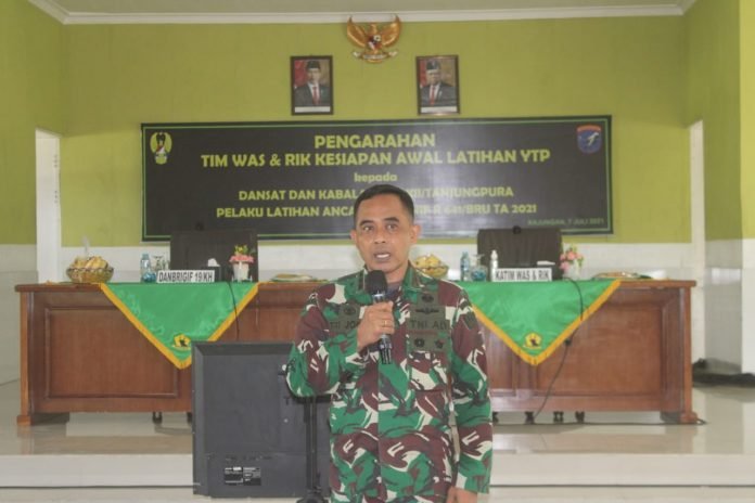ACTUALNEWS.ID, Mempawah – Rabu (7/7/21) – Komandan Brigade Infanteri (Danbrigif) 19/Khatulistiwa, Kolonel Inf Fikri Ferdian, S.Sos., M.M. mendampingi Tim Pengawasan dan Pemeriksaan Awal Latihan Ancab YTP R 641/Bru dari Staf Latihan Angkatan Darat (Slatad) memeriksa kesiapan Yonzipur 6/SD. Pemeriksaan berlangsung di Mayonzipur 6/SD, Anjungan, Mempawah.