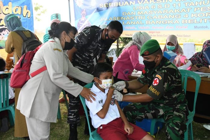 ACTUALNEWS.ID, Babel – Pangkalan TNI AL Bangka Belitung melaksanakan serbuan vaksin maritim dengan sasaran usia 6 sampai dengan 11 tahun dan masyarakat pesisir yang ditinjau langsung oleh Danlanal Babel Kolonel Laut (P) Fajar Hernawan didampingi Ketua Jalasenastri Cabang 4 Korcab III DJA 1 bertempat di Posal Muntok Kabupaten Bangka Barat, Senin (31/01/2022).