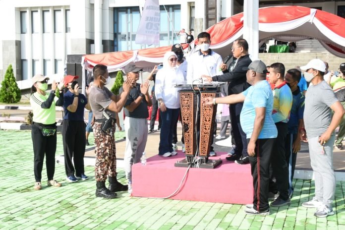 ACTUALNEWS.ID, Merauke, 22 Januari 2022,– Jalan santai dan senam massal menjadi pembuka seluruh rangkaian kegiatan dalam rangka HUT Kota Merauke ke-120 tahun 2022. Kemudian dilanjutkan dengan senam bersama, pencanangan HUT Kota Merauke oleh Wakil Bupati Merauke H. Riduwan didampingi Danlantamal XI Merauke Brigjen TNI (Mar) Edy Prakoso, S.E., serta unsur Forkompimda lainnya ditandai dengan pelepasan balon. Selanjutnya Wakil Bupati Merauke H. Riduwan mengikuti jalan santai sambil menyapa masyarakat didampingi Danlantamal XI Merauke Brigjen TNI (Mar) Edy Prakoso, S.E. serta unsur forkompimda lainya. Diperkirakan tidak kurang dari 300 orang ikut memeriahkan kegiatan tersebut termasuk perwakilan anggota Lantamal XI Merauke.