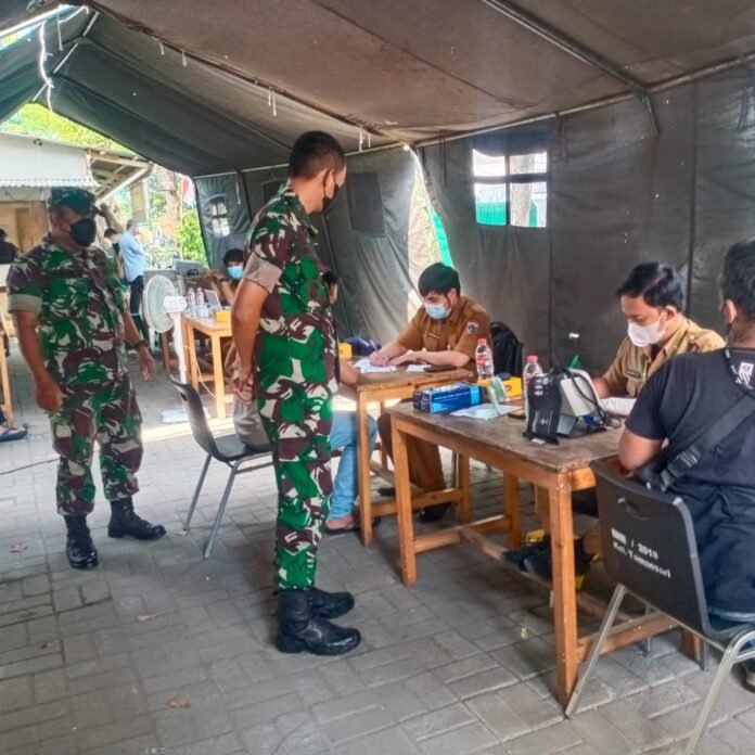 ACTUALNEWS.ID, Kodam Jaya, Jakarta Barat – Komandan Rayol Militer (Danramil) 01/Tamansari Kodim 0503/Jakarta Barat, Kapten Inf Mulia Adi Dharma pantau langsung serbuan vaksinasi di halaman stadion sepak bola Tamansari Jalan Mangga Besar VI Utara, Rt. 008/001, Kel. Tamansari, Kec. Tamansari, Jakarta Barat. Senin (08/08/2022).