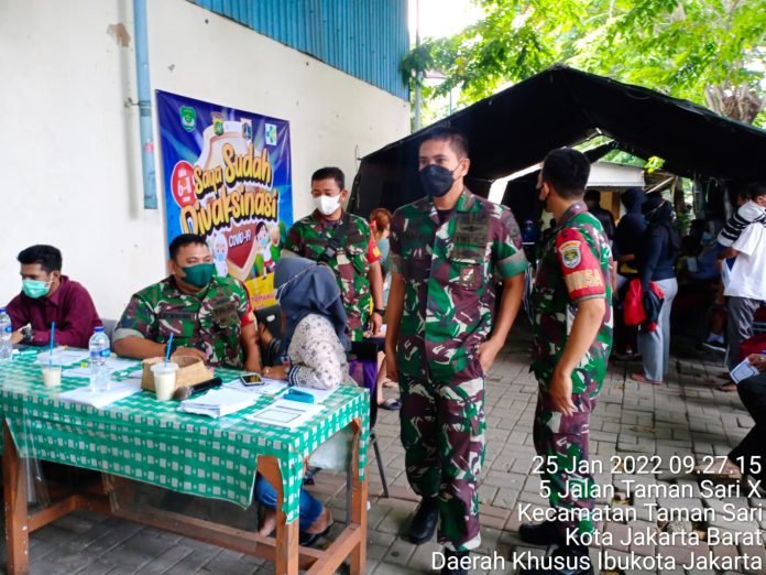 ACTUALNEWS.ID, Jakarta Barat – Komandan Rayon Militer (Danramil) 01/Tamansari Kodim 0503/Jakarta Barat, Mayor Inf Zulkarnaen Galib meninjau serbuan vaksinasi yang di laksanakan di halaman stadion sepak bola Tamansari Jalan Mangga Besar VI Utara, Rt. 008/001, Kel. Tamansari, Kec. Tamansari-Jakarta Barat, Selasa, (25/01).