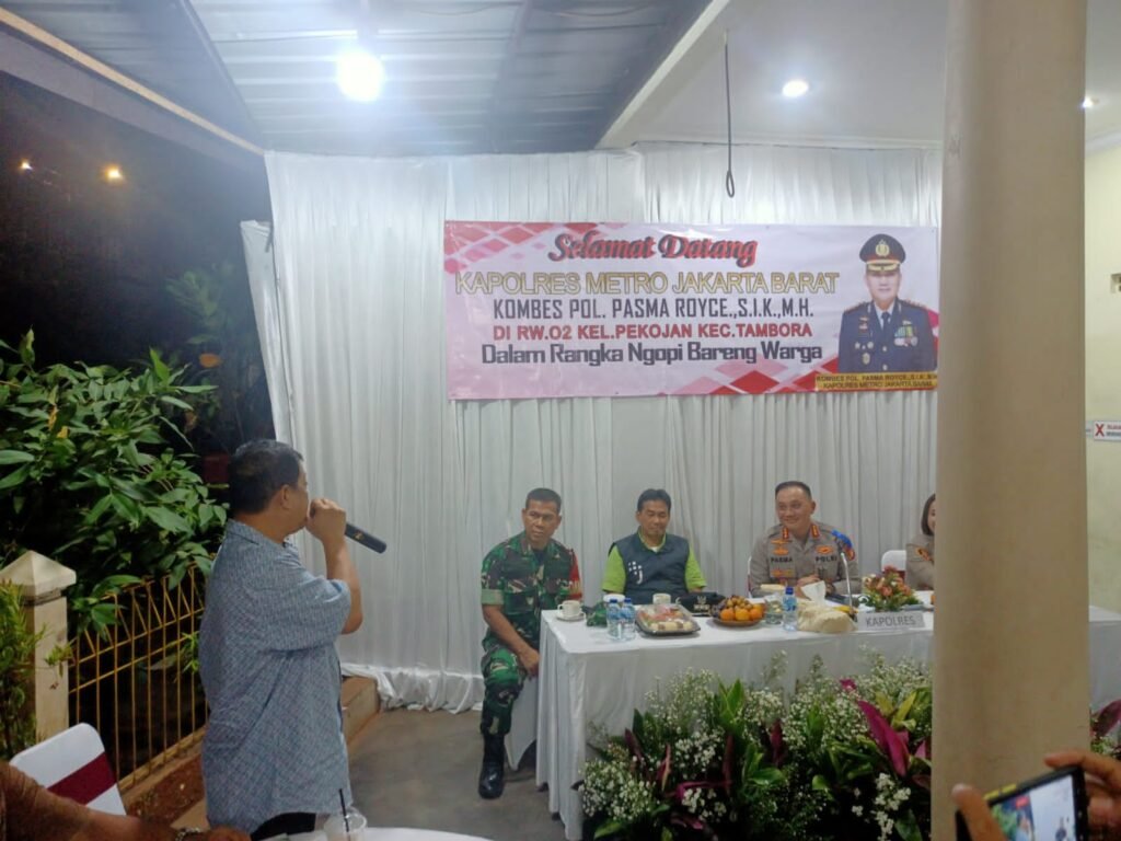 ACTUALNEWS.ID, Kodam Jaya Jakarta -Danramil 02/TB Kodim 0503/JB Kapten Inf Arja Suarja bersama Kapolsek Tambora Kompol Rosana Albertina Labobar. S.I.K M.S.I dan Camat Tambora Bambang Sutarna dampingi Kapolres Metro Jakarta Barat Kombes Pol. Pasma ROYCE S.I.K M.H.dalam kegiatan Ngopi Bareng Warga bersama Tiga Pilar bertempat di Pos RW 02 Kel Pekojan Jl.pengukiran 4 no 1A RT 002/02 Kel. Pekojan Kec.Tambora Jakarta Barat.Kamis (16/6).