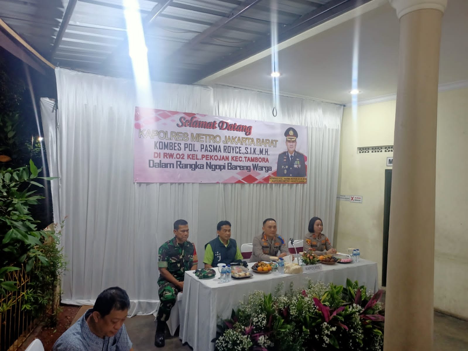 ACTUALNEWS.ID, Kodam Jaya Jakarta -Danramil 02/TB Kodim 0503/JB Kapten Inf Arja Suarja bersama Kapolsek Tambora Kompol Rosana Albertina Labobar. S.I.K M.S.I dan Camat Tambora Bambang Sutarna dampingi Kapolres Metro Jakarta Barat Kombes Pol. Pasma ROYCE S.I.K M.H.dalam kegiatan Ngopi Bareng Warga bersama Tiga Pilar bertempat di Pos RW 02 Kel Pekojan Jl.pengukiran 4 no 1A RT 002/02 Kel. Pekojan Kec.Tambora Jakarta Barat.Kamis (16/6).