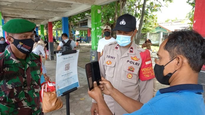 ACTUALNEWS.ID, Kepulauan Seribu – Aktivitas Babinsa Koramil 04 / Kepulauan Seribu Kodim 0502/JU, Serda Sulisno bersama Tri Pilar tak pernah putus menerapkan pendisiplinan Protokol Kesehatan (Prokes) terhadap masyarakat dan wisatawan yang tiba di dermaga kedatangan Kepulauan Seribu, Senin (31/01/22)