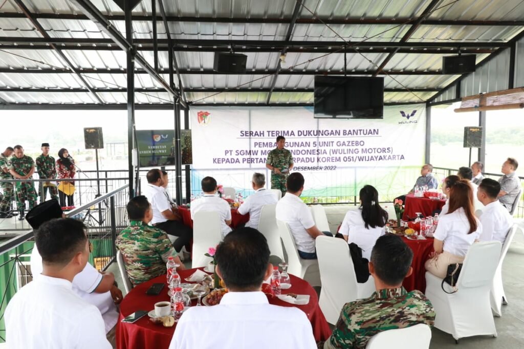 ACTUALNEWS.ID, Cikarang – Komandan Korem 051/Wkt Brigjen TNI Yustinus Nono Yulianto, S.E., M.Si., memimpin acara penyerahan CSR dari PT SGMW Motor Indonesia berupa 5 buah Gazebo kepada Korem 051/Wkt bertempat di Lahan Pertanian Terpadu Korem 051/Wkt Wanajaya Kab. Bekasi. Jumat, (30/12/2022).