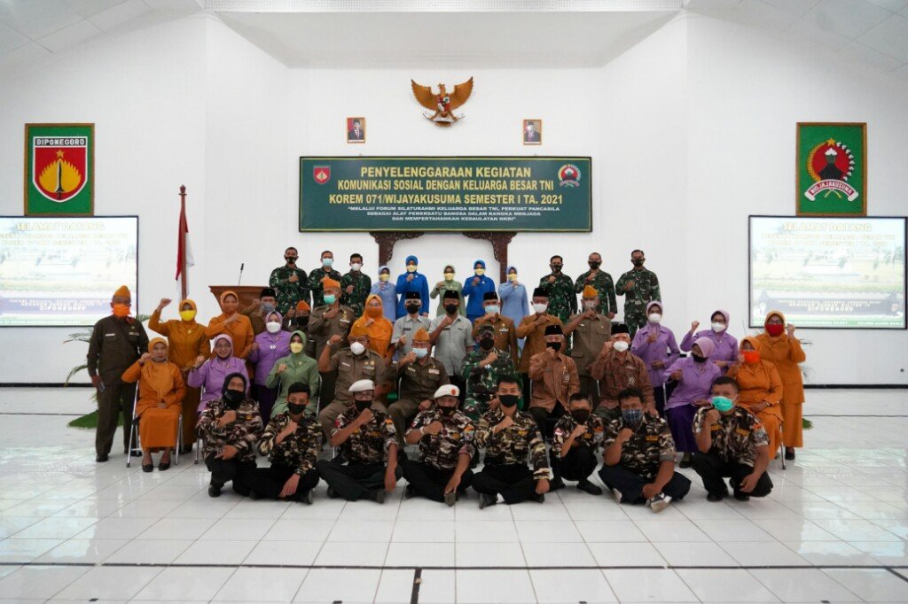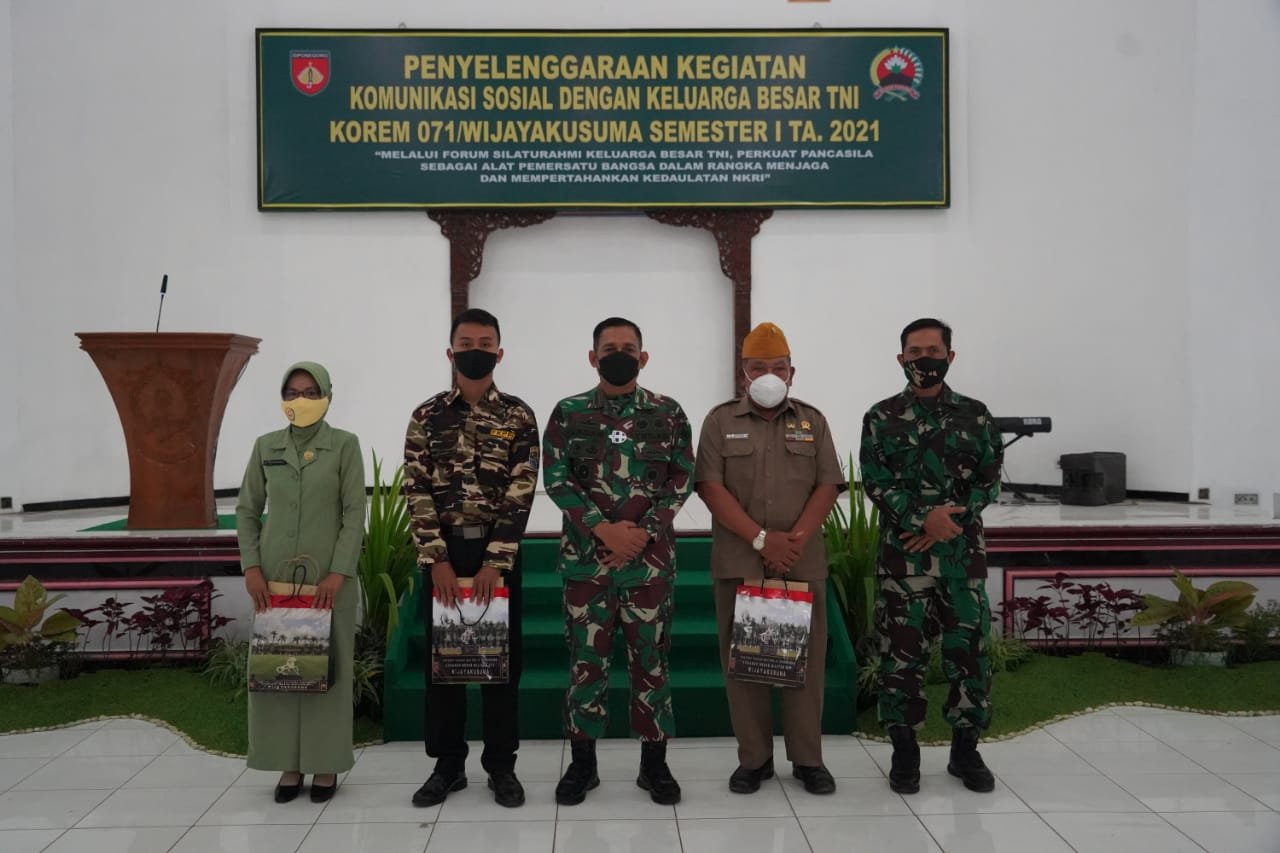 ACTUALNEWS.ID, Banyumas – Demikian penegasan Komandan Korem 071/Wijayakusuma, Kolonel Inf Dwi Lagan Safrudin, S.I.P., saat memberikan sambutan di hadapan para KBT (Keluarga Besar TNI) Korem 071/Wijayakusuma, dalam acara Penyelenggaraan Kegiatan Komunikasi Sosial dengan Keluarga Besar TNI Korem 071/Wijayakusuma, Semester I TA. 2021, Kamis (20/5/2021) di Gedung Pertemuan A. Yani Makorem 071/Wijayakusuma, Sokaraja, Banyumas.